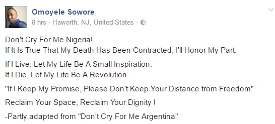 Don't cry for me. I will honour my part if truly my death has been contracted - Saharareporters owner, Omoyele Sowore, has posted yet another message as war with Senator Dino Melaye continues