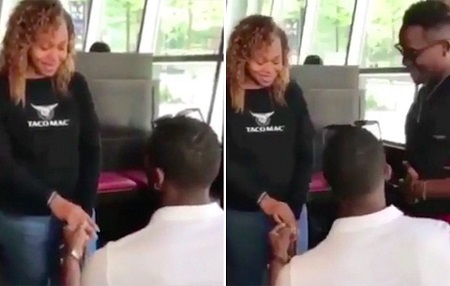 One of the two boyfriends showed up to surprise her at the sports bar she works at. He got down on a knee to propose to her.