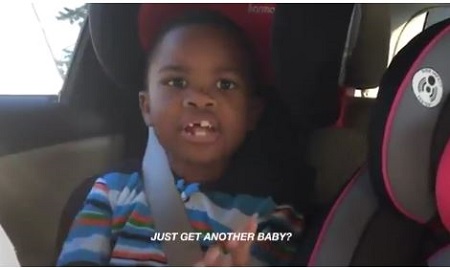 The American toddler, called Trey by his mom, then spends the next minute-and-a-half explaining why his mother is wrong to 'replace' him with another baby.