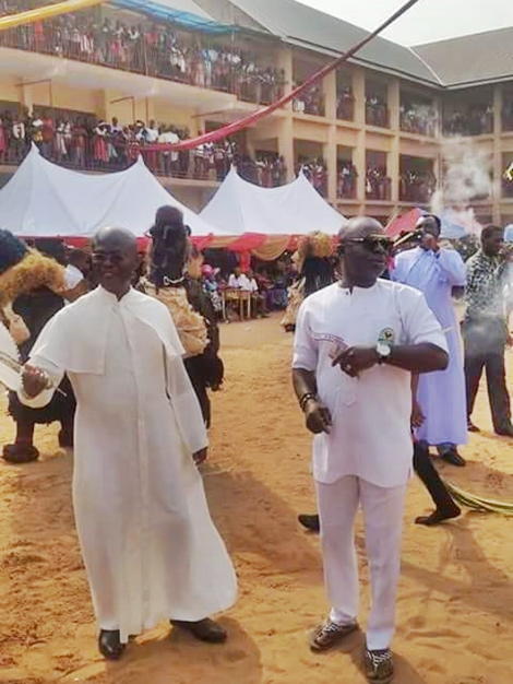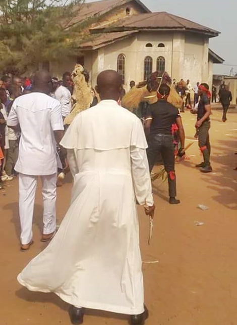 According to a Facebook user, Emeka Promise who posted the photos, a Priest of St. Paul's Catholic Church in the Ukpo area of Nnewi in Anambra State, has been pictured publicly dancing with idol worshipers and their masquerades.